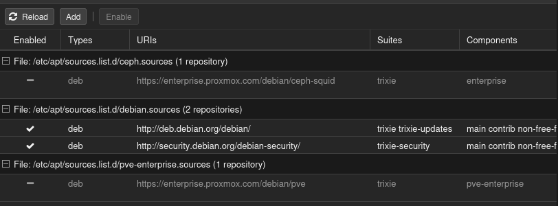 Dans Datacenter -> Updates -> Repositories vous pouvez désactiver les répertoires Ceph (je n'ai pas assez de nœuds pour en faire efficacement) et PVE-Entreprise.