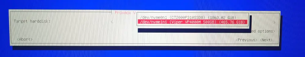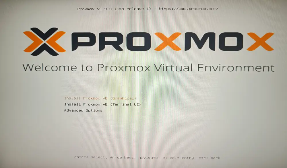 On redémarre (en sauvergardant) et normalement on accès à la page d'installation du PVE. D'ici on peux faire une installation graphique ou terminal. Sans de souris supplémentaire sous la main j'ai opté pour l'installation via TUI.